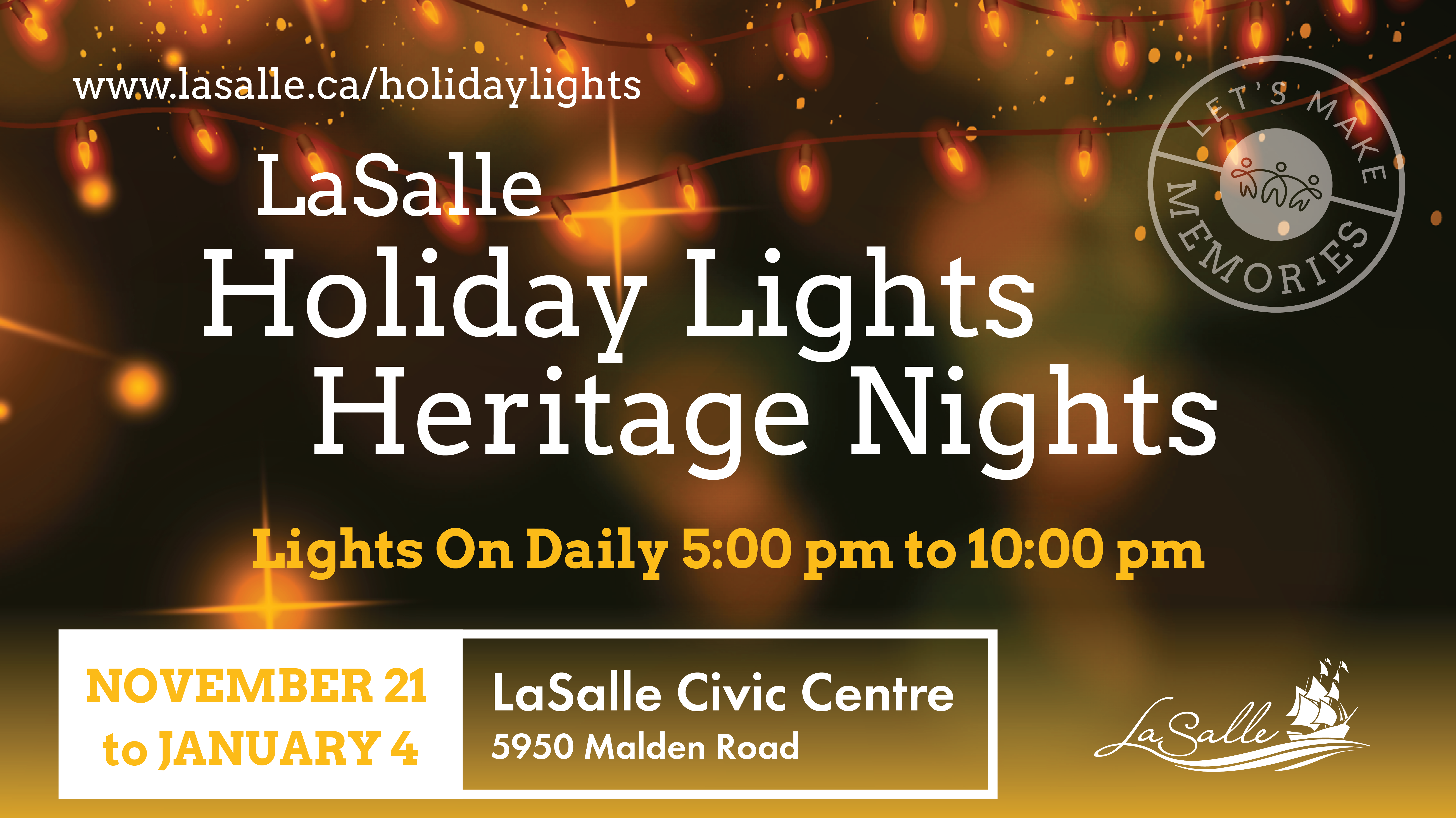 The Town of LaSalle hosts the annual Holiday Lights Heritage Nights event at the LaSalle Civic Centre, 5950 Malden Road. This beautiful outdoor light display will transform the area into a magical outdoor walk-through holiday wonderland. The lights...