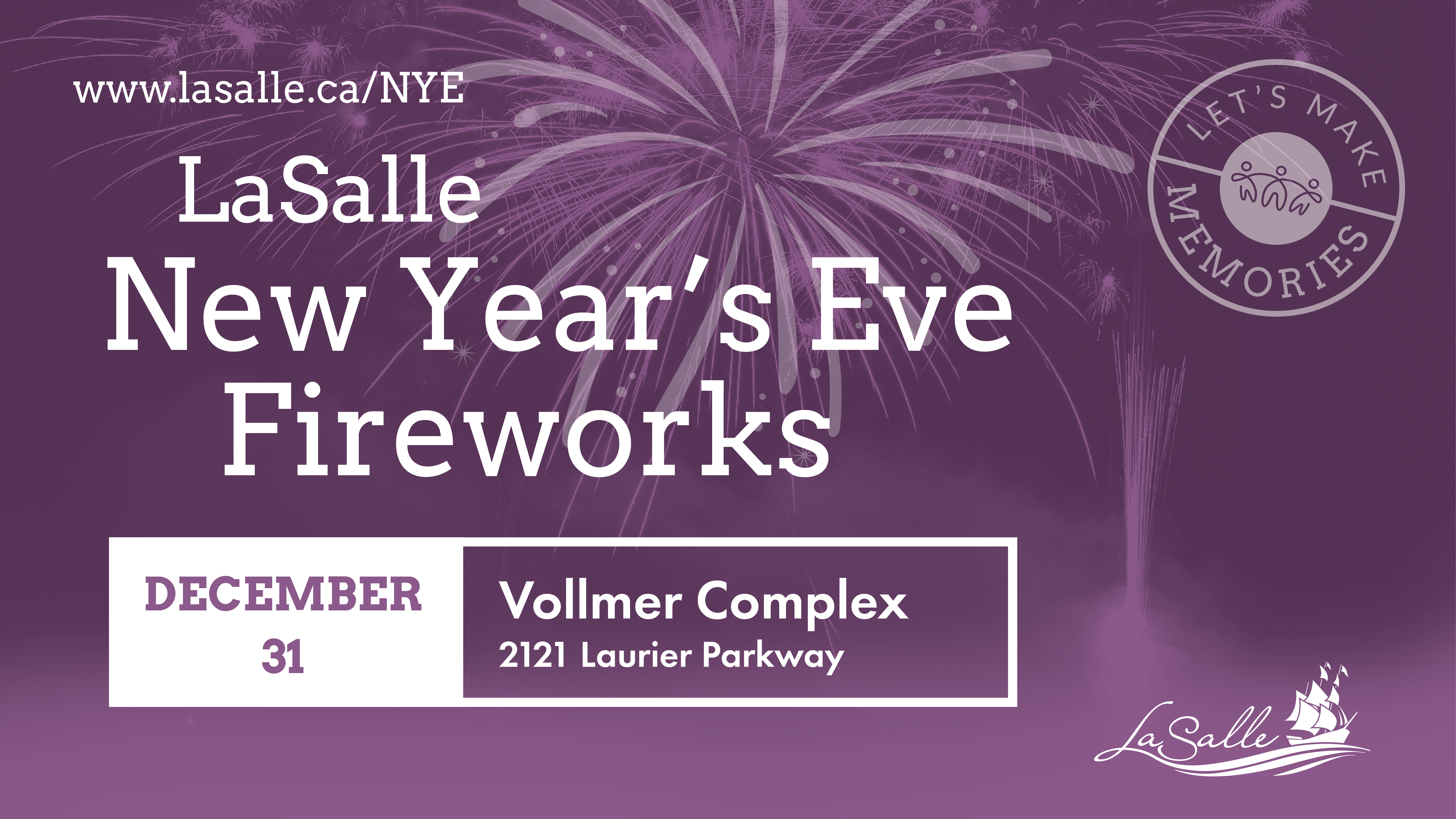 Ring in the New Year with the LaSalle New Year's Eve Fireworks on Wednesday, December 31 at 7:30 pm. Fireworks will be launched behind the outdoor pavilion at the Vollmer Complex, 2121 Laurier Parkway.